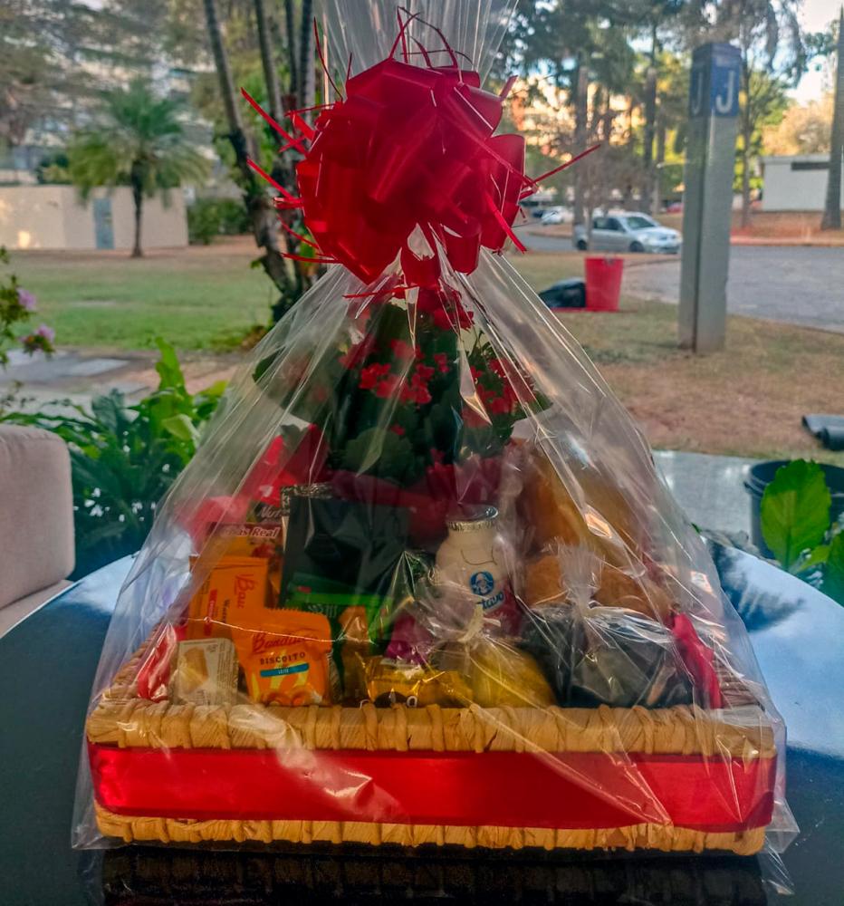 *A cesta será embrulhada em papel celofane transparente e arrematada com um laço.