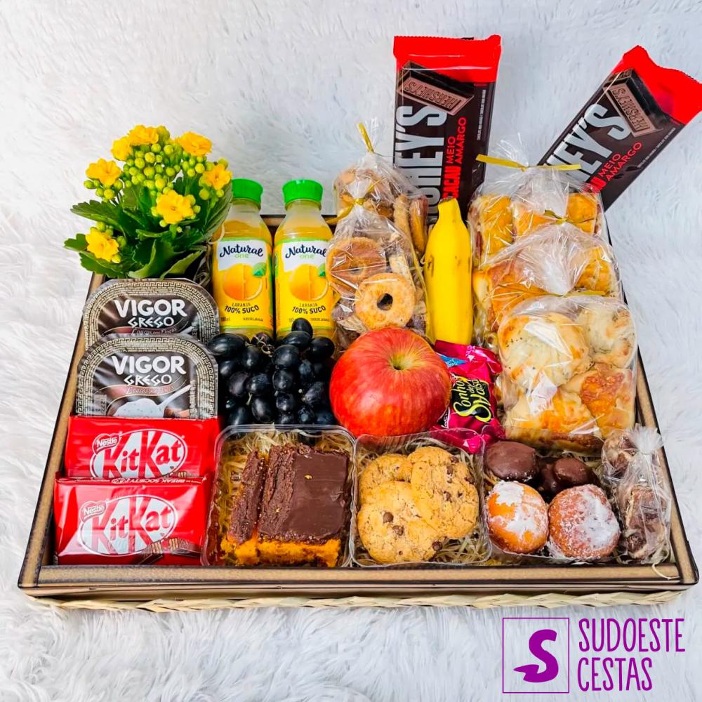 *A cesta será embrulhada em papel celofane transparente e arrematada com um laço.